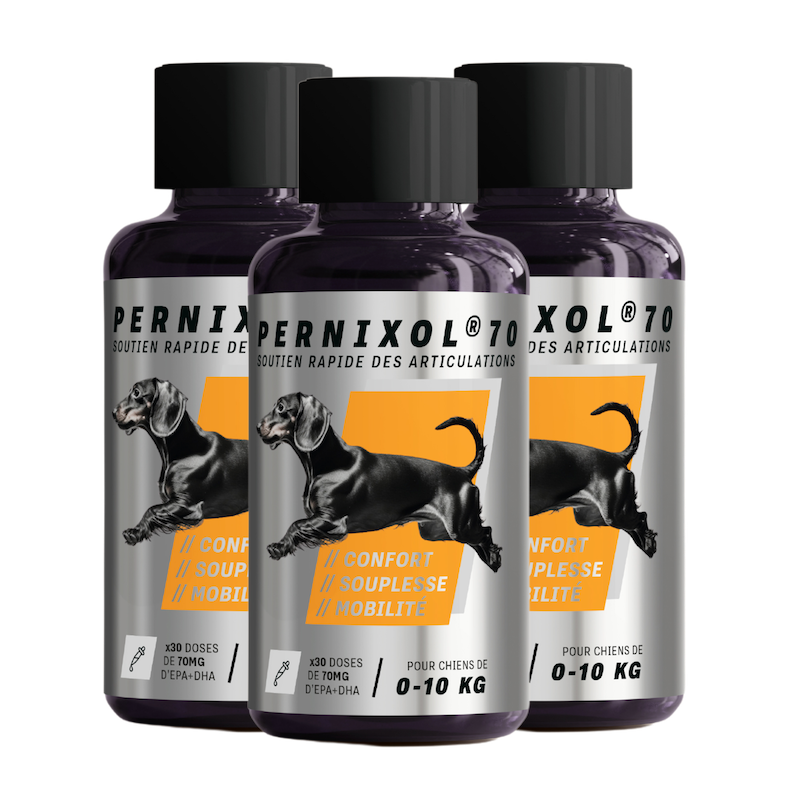 Cela fait la deuxième fois que j'achète le Pernixol à ma chienne Berger Australien de 8 ans pour ses articulations et, il me semble, qu'après une bonne cure de 2 à 3 mois, elle va beaucoup mieux.